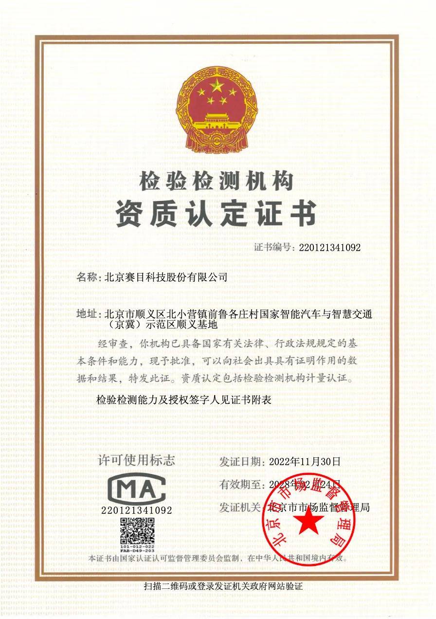 赛目科技在智能网联汽车测试领域持续加强资质建设,公司旗下的CMA认证实验室位于顺义的国家智能汽车与智慧交通(京冀)示范区顺义基地,并于2022年2月成功通过北京市市场监督管理局的严格审核,获得检验检测机构资质认定证书(CMA资质,证书编号:2)。