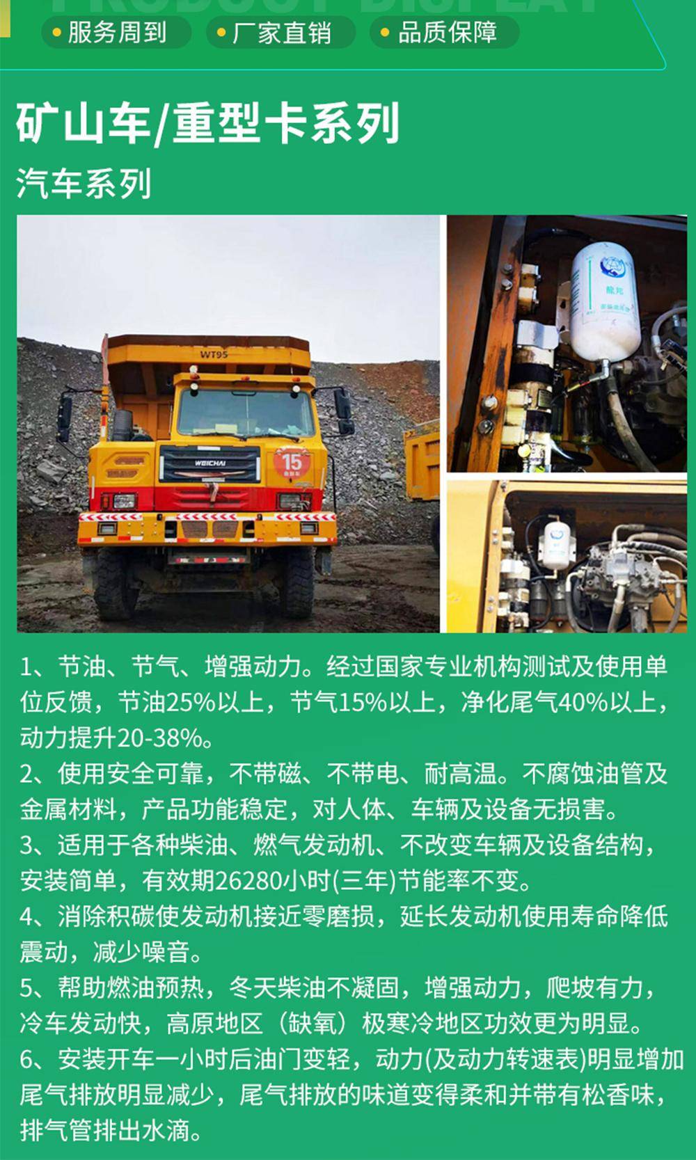 针对矿山车、重型卡车等运输设备,龙邦节能环保滤清器通过优化进气系统,提升发动机燃烧效率,实现动力增强与排放降低的双重目标。经权威机构检测及用户实测,该产品可使重型卡车节油率达25%以上,节气率15%以上,尾气净化率超40%,动力提升20%至38%。在高寒地区,冷车启动时间缩短50%,发动机磨损降低40%,无需添加尿素水即可满足排放标准。目前,该产品已在矿区、港口等重型卡车密集区域广泛应用,覆盖车辆超10万台。